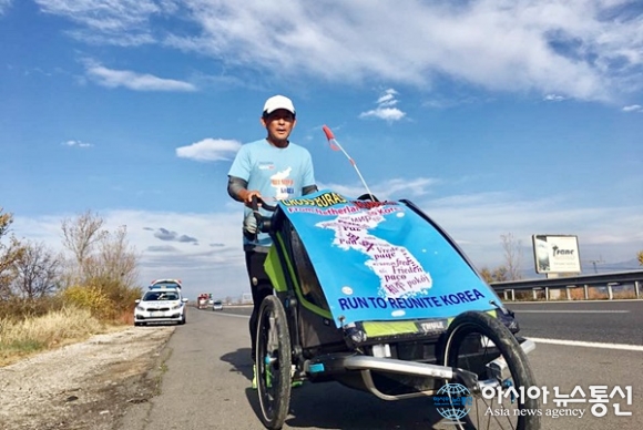| 불가리아 소피아서 바카렐로 가는 길에 한혈마(유모차)를 밀며 달리고 있는 강명구씨.(사진=김나라) |