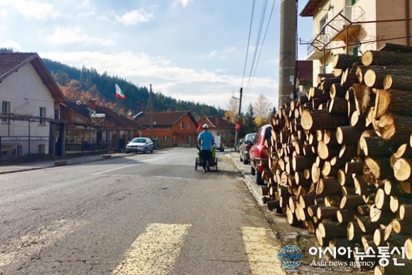 | 불가리아 바카렐에서 벨로보로 가는 길에 한 마을을 지나고 있는 강명구 평화마라토너.(사진=김나라) |