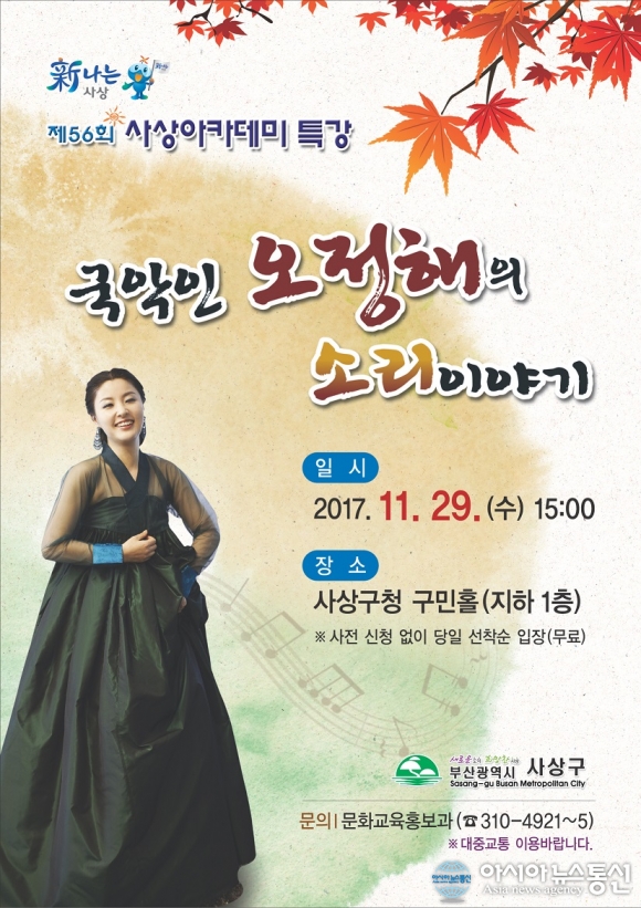 | 오는 29일 사상구는 사상구청 구민홀에서 국악인 오정해씨를 초청해 ‘사상아카데미 특강’을 진행한다.(사진제공=사상구청) |