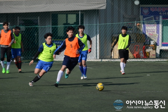 | 25일 충북 청주시 충북풋살클럽에서 제4회 직지배 풋살대회 고등부 경기가 펼쳐지고 있는 가운데 선수들의 볼다툼이 치열하다./아시아뉴스통신=정홍철 기자 |