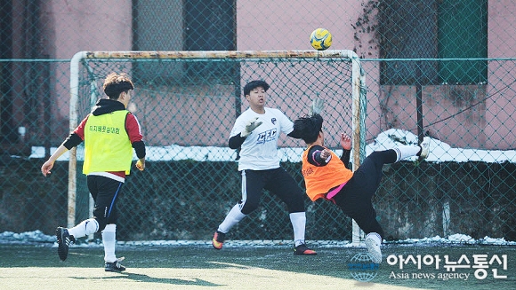 | 25일 충북 청주시 충북풋살클럽에서 제4회 직지배 풋살대회 고등부 경기가 펼쳐지고 있는 가운데 한 선수가 득점을 노리며 슈팅을 날리고 있다./아시아뉴스통신=정홍철 기자 |