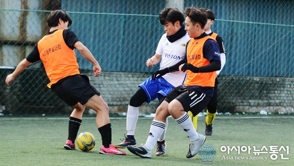 | 25일 충북 청주시 공항풋살에서 제4회 직지배 풋살대회 일반부 경기가 펼쳐지고 있는 가운데 한 선수가 두 명의 수비벽을 뚫기 위해 돌파를 시도하고 있다./아시아뉴스통신=정홍철 기자 |