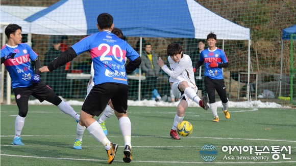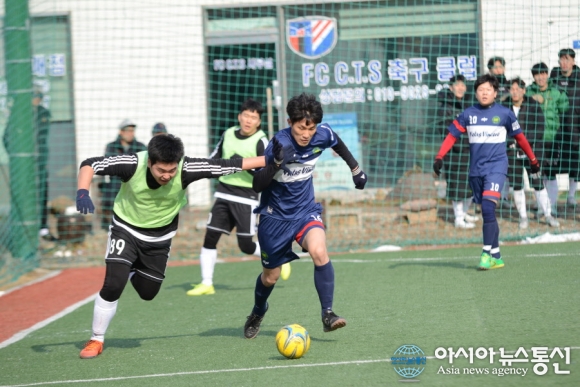 | 25일 충북 청주시 공항풋살에서 제4회 직지배 풋살대회 일반부 경기가 펼쳐지고 있는 가운데 두 선수가 공을 선점하기 위해 쇄도하고 있다./아시아뉴스통신=정홍철 기자 |