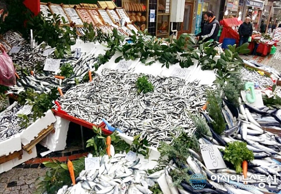 | 터키는 흑해와 에게해에 접해 있다. 터키 에디르네 수산시장에 수산물이 쌓여 있다.(사진=강명구) |