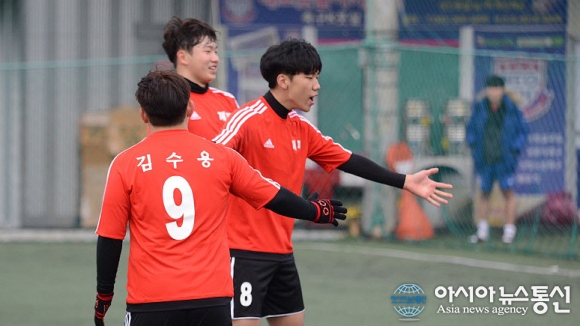 | 26일 충북 청주시 충북풋살클럽에서 제4회 직지배 풋살대회 고등부 경기가 이틀째 펼쳐지고 있다. 골을 넣은 선수들이 함께 득점의 기쁨을 만끽하고 있다./아시아뉴스통신=정홍철 기자 |