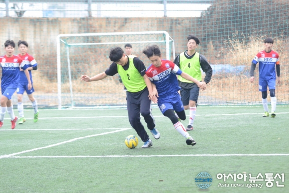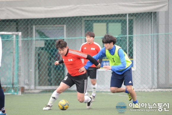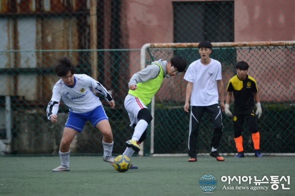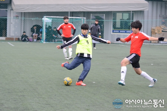 | 26일 충북 청주시 충북풋살클럽에서 제4회 직지배 풋살대회 고등부 경기가 이틀째 펼쳐지고 있다. 우승컵을 차지하기 위한 선수들의 볼다툼이 치열하다./아시아뉴스통신=정홍철 기자 |