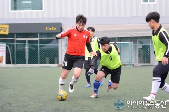 | 26일 충북 청주시 충북풋살클럽에서 제4회 직지배 풋살대회 고등부 경기가 이틀째 펼쳐지고 있다. 돌파를 시도하는 선수와 수비수의 볼다툼이 치열하다./아시아뉴스통신=정홍철 기자 |