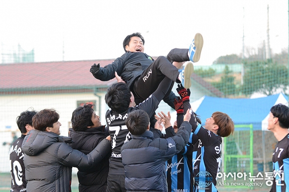 | 26일 충북 청주시 공항풋살구장에서 열린 제4회 직지배 풋살대회 일반부 시상식을 마치고 우승을 차지한 울프팀 선수들이 신동구 감독을 헹가래 태우며 우승의 기쁨을 나누고 있다./아시아뉴스통신=정홍철 기자 |