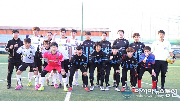 | 26일 충북 청주시 공항풋살구장에서 열린 제4회 직지배 풋살대회 일반부 결승전 킥오프를 앞두고 울프팀과 TDFS팀이 기념촬영을 하고 있다./아시아뉴스통신=정홍철 기자 |