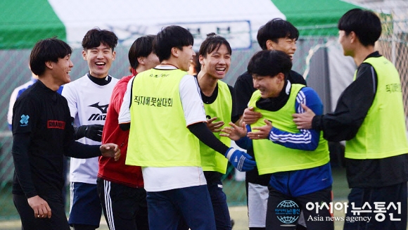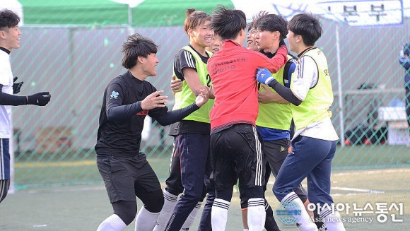 | 26일 충북 청주시 충북풋살클럽에서 이틀간의 고등부 경기를 마감하며 3·4위전으로 어벤져스와 인직FS가 맞붙었다. 2대2 무승부로 승부차기 끝에 어벤져스가 5대4로 3위를 차지했다. 어벤져스 선수들이 3위가 확정되자 부등켜 안고 기쁨을 만끽하고 있다./아시아뉴스통신=정홍철 기자 |
