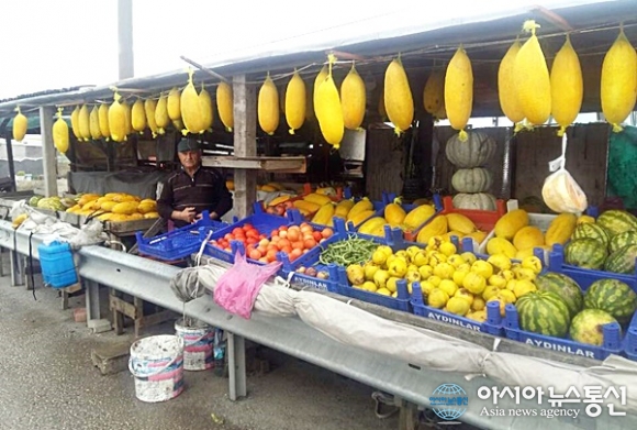 | 터키 길거리 좌판 과일가게에 처음 보는 길쭉한 모양으로 매달려 있는 노란 멜론.(사진=강명구) |