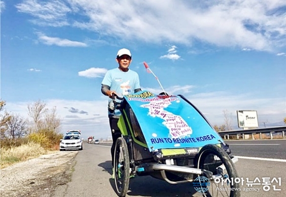 | 평화통일 메시지를 전하며 유라시아대륙횡단 마라톤을 벌이고 있는 강명구 선수.(사진제공=조직위) |