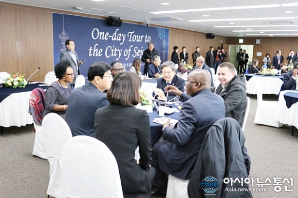 | 6일 오전 주한외교사절 24개국 45명이 '원데이투어' 행사를 위해 세종시를 방문해 세종실에서 환담을 나누고 있다. 이날 코트디부아르 Sylvestre Kouassi Bile 대사를 비롯한 사절들은 시청, 도시홍보관, 정부세종청사 옥상정원, 대통령기록관, 초려역사공원 등을 방문할 예정이다./아시아뉴스통신=홍근진 기자 |