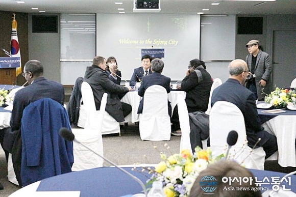 | 6일 코트디부아르 Sylvestre Kouassi Bile 대사를 비롯 24개국 45명의 주한외교사절이 세종시를 방문, '원데이투어' 행사에 앞서 세종실에서 이춘희 시장, 이원재 행복도시건설청장 등이 사절들과 환담을 나누고 있다./아시아뉴스통신=홍근진 기자 |