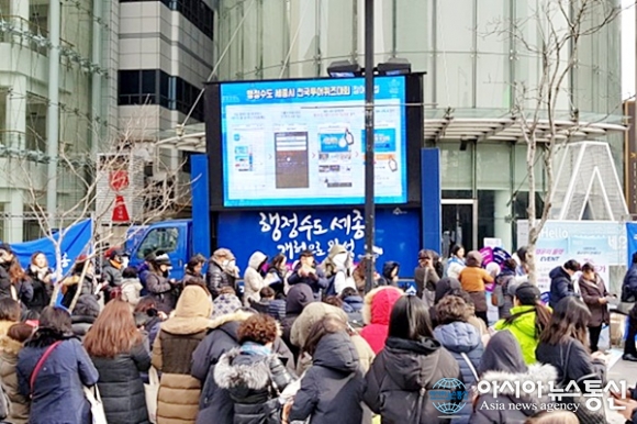 | 14일 세종시 행정수도 완성 이동식 홍보관이 서울 광화문 동아광장 일대에서 '세종시행정수도' 완성의 당위성과 지방분권의 중요성을 알리기 위한 홍보활동을 전개했다.(사진제공=세종시청) |