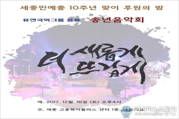 | 한국민족예술단체총연합 세종지회가 출범 10주년을 맞아 16일 오후 4시 세종고용복지+센터 회의실에서 후원의 밤 '더 새롭게 더 뜨겁게'를 개최한다. 이날 행사에서는 퓨전국악그룹 풍류가 기획한 7가지 테마의 11개 프로그램이 공연될 예정이다.(사진제공=민예총) |