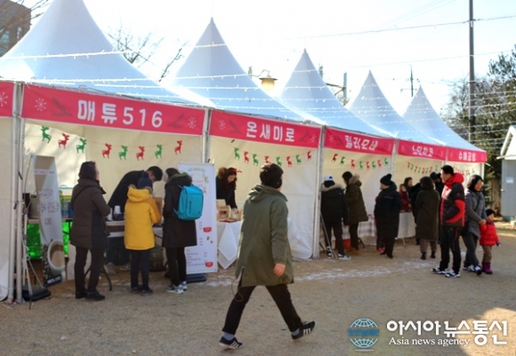 | 세종시 조치원 도시재생 프로그램의 하나로 16일 구 정수장 터에서 열린 '크리스마스 마켓' 행사장에 마련된 벼룩시장 부스에 시민들이 하나 둘 몰려 들고 있다./아시아뉴스통신=홍근진 기자 |