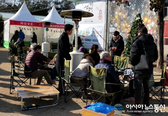 | 세종시 조치원 도시재생 프로그램의 하나로 16일 구 정수장 터에서 열린 '크리스마스 마켓'에 온 서금택 시의원을 비롯한 시민들이 산타카페에서 정담을 나누고 있다./아시아뉴스통신=홍근진 기자 |