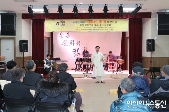 | 16일 세종시 고용복지+센터 회의실에서 민예총 송년음악회가 강영숙 지회장, 이춘희 시장, 인병택 시문화재단 대표이사, 임효림 고문 등 100여명이 참석해 열린 가운데 부정과 액을 막아주고 축복을 기원하는 비나리가 퓨전국악그룹 풍류의 서동율씨에 의해 공연되고 있다./아시아뉴스통신=홍근진 기자 |