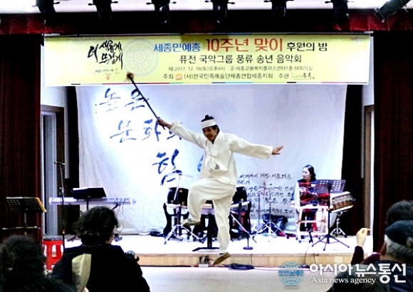| 16일 세종시 고용복지+센터 회의실에서 민예총 송년음악회가 강영숙 지회장, 이춘희 시장, 인병택 시문화재단 대표이사, 임효림 고문 등 100여명이 참석해 열린 가운데 탈을 쓰지 않고 벌이는 퍼포먼스로 음악회와 회장 등을 소개하고 있는 퓨전국악그룹 풍류의 이성희씨./아시아뉴스통신=홍근진 기자 |
