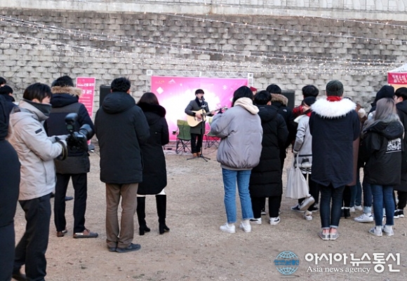| 16일 세종시 조치원읍 구 정수장 '크리스마스 선물 마켓'에서 인디 아티스트가 캐롤 버스킹을 하고 있는 가운데 추운 날씨에도 불구하고 관객들이 서서 공연을 보고 있다./아시아뉴스통신=홍근진 기자 |