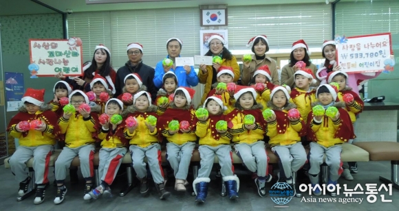| 지난 14일 부산 사상구 모라3동 행정복지센터(동장 박행철)에 민들레어린이집(원장 임정희) 원생들이 저금통을 들고 방문했다. 산타 복을 입은 어린이들은 지난 1년간 한푼 두푼 모은 돈 50만 3980원을 희망 2018년을 기약하는 이웃돕기 성금으로 전달했다.(사진제공=사상구청) |