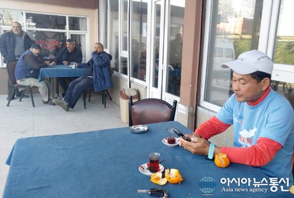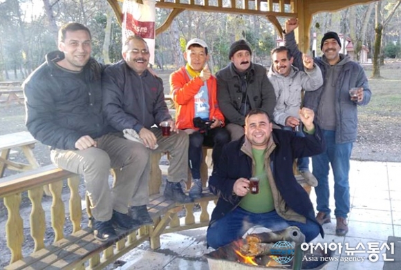 | 터키 바프러에서 삼순시로 가는 길에 만난 터키 남자들과 차 한잔하며 포즈를 취했다.(사진=송인엽) |