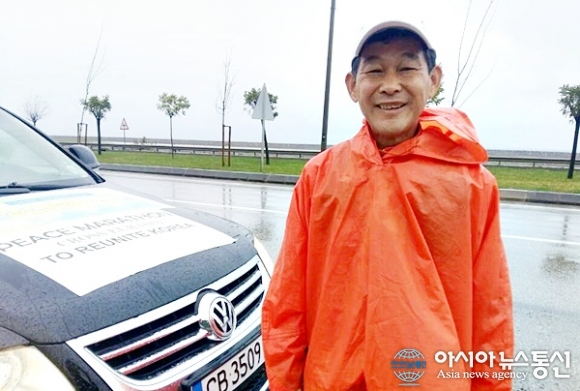 | 터키에서 무술년 새해 첫날 비가 오는 가운데 달리기를 시작하는 강명구 선수 모습.(사진=송인엽) |