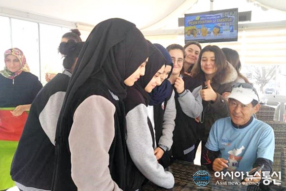 | 터키의 Espiye서 Eynesil로 가는 길에 현지 여학생들에게 TV 인터뷰를 보여주고 있다.(사진=송인엽) |
