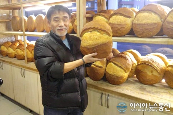 | 터키 Eynesil의 빵가게에서 자신의 얼굴보다 더 큰 빵을 들고 웃고 있는 송인엽 교수.(사진=강명구) |