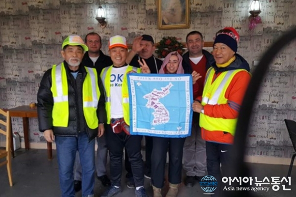| 그루지아 Shorapani에서 현지인들과 AOK가 만든 통일보자기를 들고 사진을 찍고있다.(사진=강명구) |
