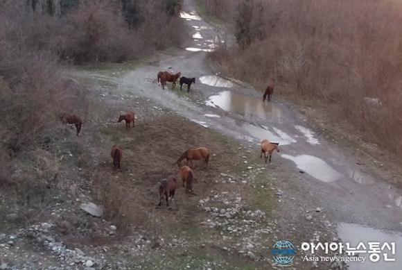 | 그루지아 게구티서 Shorapani로 가는 길에 들판에서 풀을 뜯어 먹고 있는 야생말들.(사진=강명구) |