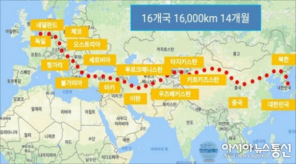 | 평화마라토너 강명구 선수가 1년 2개월 동안 달리는 유라시아대륙횡단 코스.(사진제공=조직위원회) |