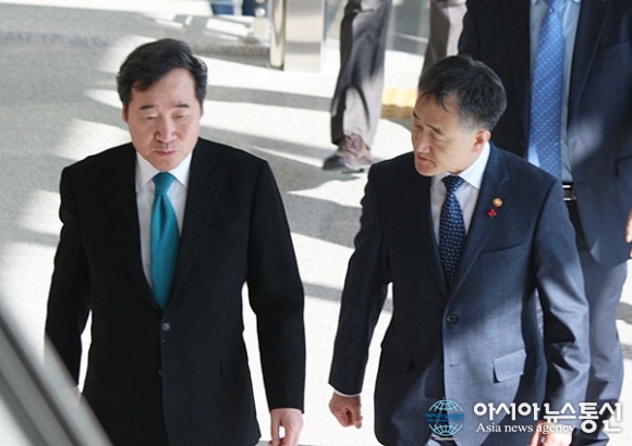 | 23일 오후 세종시 컨벤션센터 국제회의장에서 '국민건강 확보'를 주제로 열린 보건복지부 식품의약품안전처 농림축산식품부 해양수산부 환경부 등의 정부업무보고에 참석하기 위해 이낙연 총리가 박능후 복지부장관과 함께 에스컬레이터로 이동하고 있다./아시아뉴스통신=홍근진 기자 |