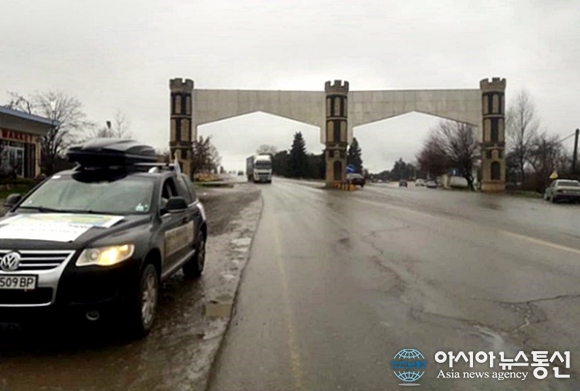 | 그루지야에서 아제르바이잔으로 들어서 얼마가지 않은 지점에 있는 대형 게이트 모습.(사진=강명구) |