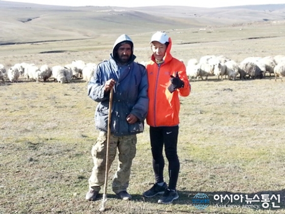 | 그루지야 트빌리시를 벗어나 초원에서 만난 한 양치기 목동과 기념사진을 찍고 있다.(사진=강명구) |