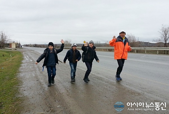 | 그루지야 알게티 지역을 지나다 만난 이 지역 어린이들이 따라오며 함께 뛰고 있다.(사진=강명구) |