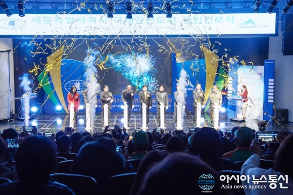 | 세종시가 31일 시청 여민실에서 이춘희 시장과 굴브란트 쉔베르그 국제안전도시공인센터 사무총장, 시의원, 시민 등 300여명이 참석한 가운데 '국제안전도시 공인 선포식'을 개최했다.(사진제공=세종시청) |