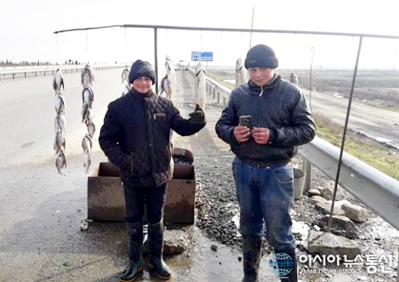 | 아제르바이잔 Borsunlu에서 Malbinasy로 가는 길에 물고기를 말려서 파는 젊은이들.(사진=강명구) |