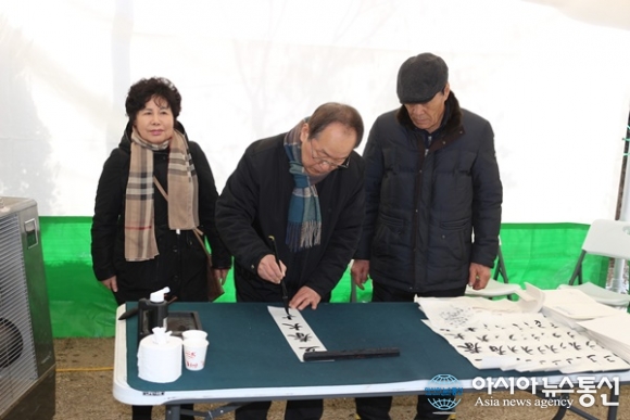 | 4일 전국 대부분 지역에 한파주의보가 내려진 가운데 세종시 조치원 구 정수장터에서 열린 '立春' 맞이 행사에서 한국서예협회 회원들이 '입춘축'을 써주고 있다./아시아뉴스통신=홍근진 기자 |