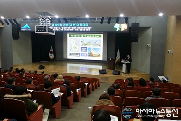 | 6일 세종시 평생교육진흥원이 시청 여민실에서 200여명의 시민이 참석한 가운데 '개헌 아카데미'로 권용우 성신여대 교수의 '개헌과 행정수도' 강의를 진행하고 있다./아시아뉴스통신=홍근진 기자 |