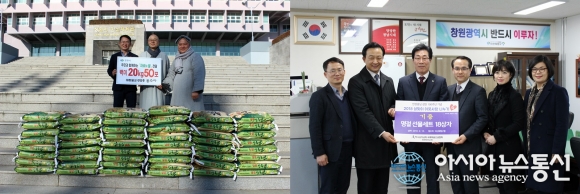 | 용수사와 하나님의 교회에서 설 명절 어려운 이웃에 전해달라며 백미와 식료품 기탁 모습.(사진제공=창원시청) |