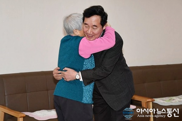 | 이낙연 총리가 13일 세종시 전의 요셉의 집을 방문해 한 노인과 포옹하고 있다.(사진출처=국무총리실) |