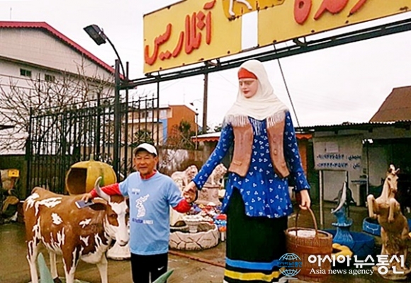 | 이란의 라슈트 지역을 지나다 젖소와 여인을 본떠 만든 인형과 기념사진을 찍고 있다.(사진=김태형) |