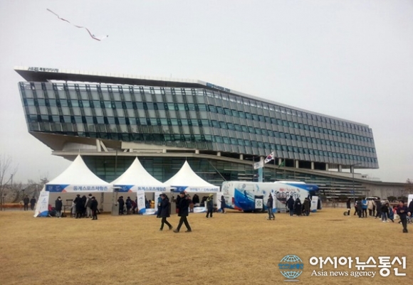 | 21일 세종시청 앞 광장에서 평창동계올림픽의 성공적인 마무리를 기원하는 이동형 간접체험행사가 열려 참가자들이 컬링과 크로스컨트리 등 동계스포츠를 체험하는 가운데 한 시민은 연 날리기를 하고 있다./아시아뉴스통신=홍근진 기자 |