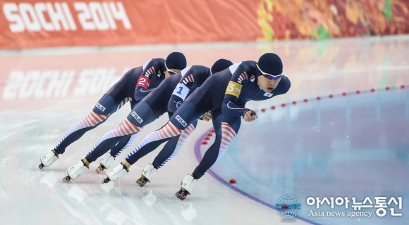 | 러시아 소치 아들레르 아레나서 열린 '2014 소치 동계올림픽' 스피드스케이팅 남자 팀 추월 경기 진행중, 대한민국 대표팀이 네덜란드 팀을 상대로 역주하고 있는 모습. 한편 이날 경기서 대한민국은 은메달을 획득했다. 이는 '팀 추월' 종목 역사상 첫 메달이라는 의미가 있다./아시아뉴스통신 DB |