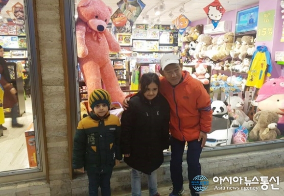 | 이란 royan의 한 인형가게 앞에서 남매로 보이는 예쁜 어린이들과 기념사진을 찍었다.(사진=김태형) |