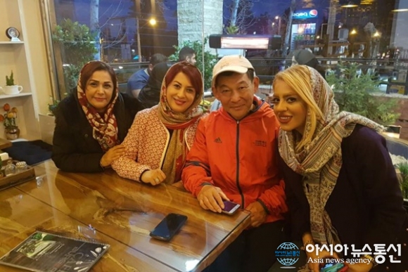 | 이란 royan의 한 카페에서 다양한 무늬의 히잡을 쓴 여자들과 기념사진을 찍고 있다.(사진=김태형) |