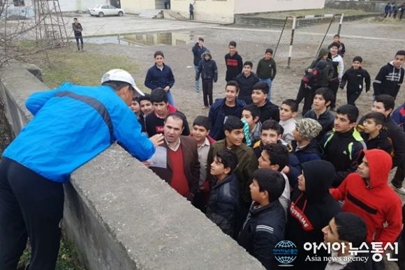 | 이란 Nowshahr에서 royan으로 가는 길에 한 학교에서 아이들에게 설명하고 있는 모습.(사진=김태형) |