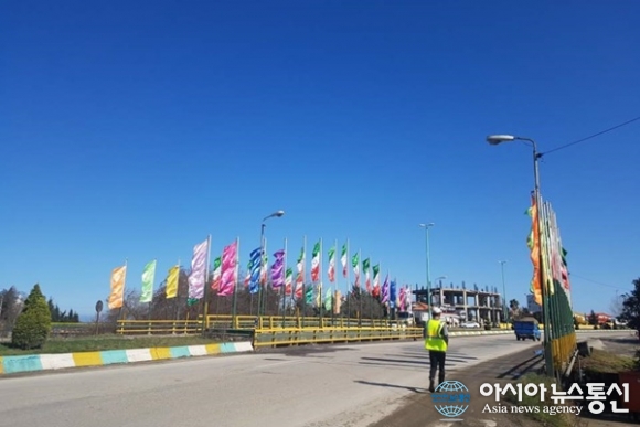 | 이란의 아바스아바드에서 Nowshahr로 가는 다리 위에 국기와 각종 깃발이 꽂혀 있다.(사진=김태형) |